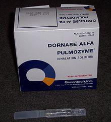 Dornase alfa (proprietary name Pulmozyme from Genentech) is a highly purified solution of recombinant human deoxyribonuclease I (rhDNase), an enzyme which selectively cleaves DNA. Dornase alfa hydrolyzes the DNA present in sputum/mucus of cystic fibrosis patients and reduces viscosity in the lungs, promoting improved clearance of secretions. This protein therapeutic agent is produced in Chinese hamster ovary cells.