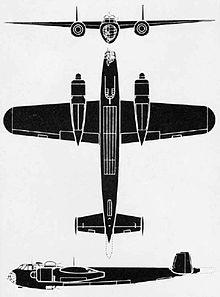 All the Do 217E variants were fitted with unitized, BMW 801A air-cooled 14-cylinder radial aircraft engine built by BMW.[24][25] The early E-series variants were meant to be fitted with a BMW 801B engine design for portside use to employ counter-rotating propellers as a few other multi-engined Luftwaffe aircraft were designed to have (as with the He 177A) but this was never accomplished. The BMW 801 radials were mounted on welded steel tube mountings at the extremities of the wing centre section. The oil coolers were integral to the front lower section of the BMW-designed cowlings, as used in all twin and multi-engined aircraft that used BMW 801 radials for power. The machine had two oil and five fuel tanks to "feed" the engines, and they were protected with rubber and self-sealing coverings. In an emergency, CO2 could be released into the tanks to extinguish fires. The engines had three-blade, light alloy VDM propeller units installed.[16] Flame dampers were also fitted in the form of "fish tail" exhaust pipes.[22] Such a configuration gave a speed of 470 kilometres per hour (250 kn) (282 mph) at sea level and 530 kilometres per hour (290 kn) (318 mph) at 6,700 metres (22,000 ft). It enabled a service ceiling of 7,300 metres (24,000 ft) when fully loaded and 8,200 metres (26,900 ft) when lightly loaded. The Do 217's range was a much more impressive 3,900 kilometres (2,400 mi), (compared with the other German bomber types).[16]