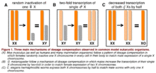 Different lineages have evolved different mechanisms to cope with the differences in gene copy numbers between the sexes that are observed on sex chromosomes. Some lineages have evolved dosage compensation, an epigenetic mechanism which restores expression of X or Z specific genes in the heterogametic sex to the same levels observed in the ancestor prior to the evolution of the sex chromosome.[2][3] Other lineages equalize the expression of the X- or Z- specific genes between the sexes, but not to the ancestral levels, i.e. they possess incomplete compensation with “dosage balance”. One example of this is X-inactivation which occurs in humans. The third documented type of gene dose regulatory mechanism is incomplete compensation without balance (sometimes referred to as incomplete or partial dosage compensation). In this system gene expression of sex-specific loci is reduced in the heterogametic sex i.e. the females in ZZ/ZW systems and males in XX/XY systems.[4]