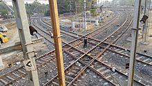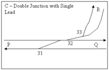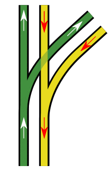 A double junction is a railway junction where a double track railway splits into two double track lines. Usually, one line is the main line and carries traffic through the junction at normal speed, while the other track is a branch line that carries traffic through the junction at reduced speed.