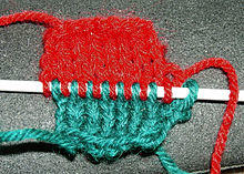 Another common method is to alternate a knit stitch of yarn A with a purl stitch of yarn B. Since the yarn is held to the back for a knit, and to the front for a purl, this results in two sheets of stockinette stitches, with the wrong (purl) sides facing each other. Switching colors ties the two sides together for a single, double-thick fabric. This method is often used for elaborate, two-color designs, as there are few constraints on how the colors may be used. The finished item from this method is reversible, each side holding the negative image of the other.