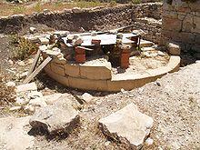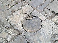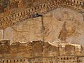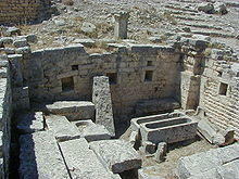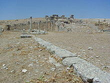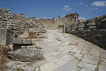 The city forum, which is 924 m2 (9,950 sq ft) in size[54] is small. It is better preserved in some places than others, because the construction of the Byzantine fort damaged a large section of it.[55] The capitol, which stands on an area surrounded by porticos, dominates its surroundings by virtue of its imposing appearance. The "square of the Rose of the Winds" (which is named after a decorative element) seems more like an esplanade leading to the Temple of Mercury, which stands on its northern side, than an open public space.[55] The city's curia and a tribune for speeches probably also stood here.[37]