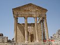 Dougga or Thugga or TBGG was a Berber, Punic and Roman settlement near present-day Téboursouk in northern Tunisia. The current archaeological site covers 65 hectares (160 acres).[1] UNESCO qualified Dougga as a World Heritage Site in 1997, believing that it represents "the best-preserved Roman small town in North Africa". The site, which lies in the middle of the countryside, has been protected from the encroachment of modern urbanization, in contrast, for example, to Carthage, which has been pillaged and rebuilt on numerous occasions. Dougga's size, its well-preserved monuments and its rich Numidian-Berber, Punic, ancient Roman and Byzantine history make it exceptional. Amongst the most famous monuments at the site are a Libyco-Punic Mausoleum, the Capitol, the Roman theatre, and the temples of Saturn and of Juno Caelestis.