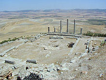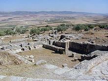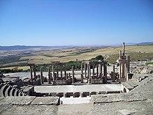 The archaeological site is located 4.6 km (2.9 mi) SSW of the modern town of Téboursouk on a plateau with an uninhibited view of the surrounding plains in the Oued Khalled.[4] The site offers a high degree of natural protection, which helps to explain its early occupation. The slope on which Dougga is built rises to the north and is bordered in the east by the cliff known as Kef Dougga.[5] Further to the east, the ridge of the Fossa Regia, a ditch and boundary made by the Romans after the destruction of Carthage, indicates Dougga's position as a point of contact between the Punic and Berber worlds.