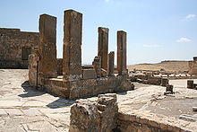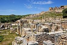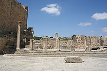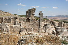 Dougga's monuments attest to its prosperity in the period from the reign of Diocletian to that of Theodosius I,[14] but it fell into a sort of stupor from the 4th century. The city appears to have experienced an early decline, as evidenced by the relatively poor remains of Christianity.[14] The period of Byzantine rule saw the area around the forum transformed into a fort; several important buildings were destroyed in order to provide the necessary materials for its construction.