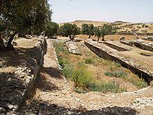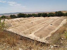The city has a circus designed for chariot racing, but it is barely visible nowadays. Originally, the circus consisted of nothing more than a field; an inscription in the temple in honor of Caracalla's victory in Germany notes that the land was donated by the Gabinii in 214 and describes it as an ager qui appellatur circus (field that serves as a circus) )[61] · .[62] In 225 though, the site was prepared and the circus was constructed. It was financed by the magistrates (duumviri and aedile) after they had promised to do so following in response to a request from the entire population of the city.[63] The circus was built to take the maximum possible advantage of the surrounding landscape, in reflection of an understandable need to limit costs in a medium-sized city with limited resources, but certainly also out of desire to finish the construction works as quickly as possible, given that magistrates’ mandates were limited to one year. The construction was nonetheless expected to have "a certain magnitude";[64] at 393 m (1,289 ft) long with a spina 190 m × 6 m (623 ft × 20 ft),[65] the circus is quite extraordinary in Roman Africa. The circus marks Dougga out as one of the most important cities in the province, alongside Carthage, Thysdrus, Leptis Magna, Hadrumet et Utica.[64] The donation of the land for the pleasure of the general populace (ad voluptatem populi) and its development following a request from the entire population (postulante universo populo) are a reminder of the importance of spectacles in the social life of Roman cities and the demand for popular entertainment.