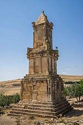 The monument owes its current appearance to the work of French archaeologist Louis Poinssot, who essentially reconstructed it from pieces that were left lying on the ground. The tomb is accessed via a pedestal with five steps. On the northern side of the podium (the lowest of three levels in the monument), there is an opening to the funeral chamber that is closed with a stone slab. The other sides are decorated with fake windows and four Aeolic pilasters. The second level is made up of a temple-like colonnade (naiskos); the columns on each side are Ionic. The third level is the most richly decorated of all: in addition to pilasters similar to those on the lowest level, it is capped with a pyramid. Some elements of carved stone have also survived.