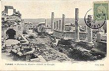 The establishment of France's Tunisian protectorate in 1881 led to the creation of a national antiquities institute (French: Institut national du patrimoine), for which the excavation of the site at Dougga was a priority from 1901, parallel to the works carried out at Carthage. The works at Dougga concentrated at first on the area around the forum; other discoveries ensured that there was an almost constant series of digs at the site until 1939. Alongside these excavations, work was conducted to restore the capitol, of which only the front and the base of the wall of the cella were still standing, and to restore the mausoleum, particularly between 1908 and 1910 .[15]