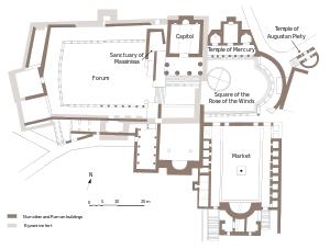 To the east, from the north to the south, are the Temple of Mercury and the Temple of August Piety, the "square of the Rose of the Winds" and the market; to the west, the western square with the capitol and immediately to the left of the capitol, the substructures of the Temple of Massinissa; in grey, the outline of the Byzantine fort