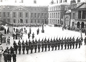 “ | In the morning [Dr Hyde] attended a service in St. Patrick's Cathedral presided over by the Archbishop of Dublin, Dr. Gregg. Mr. de Valera and his Ministerial colleagues attended a solemn Votive Mass in the Pro-Cathedral, and there were services in the principal Presbyterian and Methodist churches, as well as in the synagogue. Dr. Hyde was installed formally in Dublin Castle, where the seals of office were handed over by the Chief Justice. Some 200 persons were present, including the heads of the Judiciary and the chief dignitaries of the Churches. After the ceremony President Hyde drove in procession through the beflagged streets. The procession halted for two minutes outside the General Post Office to pay homage to the memory of the men who fell in the Easter Week rebellion of 1916. Large crowds lined the streets from the Castle to the Vice-Regal Lodge and the President was welcomed with bursts of cheering. He wore morning dress, but Mr. de Valera and Mr. Sean T. O'Kelly, who followed Dr. Hyde in the next motor-car, wore black clothes with felt hats. In the evening there was a ceremony in Dublin Castle which was without precedent in Irish history. Mr. and Mrs. de Valera received about 1,500 guests at a reception in honour of the President. The reception was held in St. Patrick's Hall, where the banners of the Knights of St. Patrick are still hung. The attendance included all the members of the Dail and Senate with their ladies, members of the Judiciary and the chiefs of the Civil Service, Dr. Paschal Robinson, the Papal Nuncio at the head of the Diplomatic Corps, several Roman Catholic Bishops, the Primate of All Ireland, the Archbishop of Dublin, the Bishop of Killaloe, the heads of the Presbyterian and Methodist congregations, the Provost and Vice Provost of Trinity College, and the President of the National University. It was the most colourful event that has been held in Dublin since the inauguration of the new order in Ireland, and the gathering, representing as it did every shade of political, religious, and social opinion in Eire [Ireland], might be regarded as a microcosm of the new Ireland.[10] | ” |