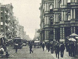 Although first used in Chicago, the steel-framed skyscraper caught on most quickly in New York City in the 1880s, and from there spread to most other American cities in the 1890s and 1900s. The apparent lack of a height limitation of this type of building set off a fervent debate over whether their height should be restricted by law, with proponents and opponents of height limits bringing out numerous arguments in favor of their position. The question of height limits also had a profound implication for the nature of downtown itself: would it continue to be a concentrated core, or as it grew, would height limits force it to spread out into a larger area.[9] In the short run, the proponents of height limits were successful in their efforts. By the 1910s, most of the largest and medium-sized cities had height limits in effect, with New York – despite several concerted efforts to enact them – Philadelphia, Detroit, Pittsburgh and Minneapolis being notable holdouts.[10]