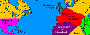 Radnal must call higher authorities to investigate the matter, and in the course of their investigation, they determine that the deceased man had a microprint in his effects outlining a plot by another nation to set off a "starbomb" (nuclear weapon) near the "Barrier Mountains" (a range of mountains joining the Sierra Nevada and the Rif across where the real-world Strait of Gibraltar is), thereby setting off one of the many geologic faults in the area, knocking a gap in the mountains, and reflooding the Bottomlands to form a new central sea, instigated apparently by Krepalga (a Homo sapiens nation occupying all or part of the Middle East, which would have benefited by having a real-world-type Mediterranean Sea up to its west border).
