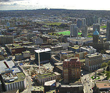 ![]() View of the Downtown Eastside and Woodward's site at dusk from Harbour Centre in summer 2018. | |
