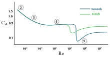 For an object with a smooth surface, and non-fixed separation points—like a sphere or circular cylinder—the drag coefficient may vary with Reynolds number Re, even up to very high values (Re of the order 107). [15] [16] For an object with well-defined fixed separation points, like a circular disk with its plane normal to the flow direction, the drag coefficient is constant for Re > 3,500.[16] Further the drag coefficient Cd is, in general, a function of the orientation of the flow with respect to the object (apart from symmetrical objects like a sphere).