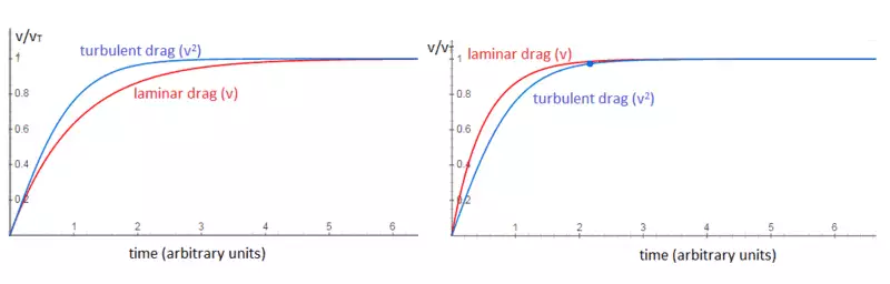which asymptotically approaches the terminal velocity . For a given , heavier objects fall more quickly.