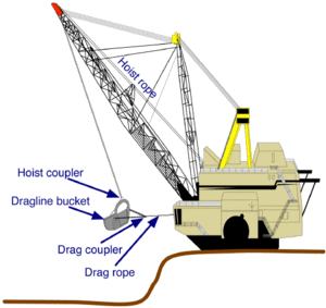 A dragline bucket system consists of a large bucket which is suspended from a boom (a large truss-like structure) with wire ropes. The bucket is maneuvered by means of a number of ropes and chains. The hoist rope, powered by large diesel or electric motors, supports the bucket and hoist-coupler assembly from the boom. The dragrope is used to draw the bucket assembly horizontally. By skillful maneuver of the hoist and the dragropes the bucket is controlled for various operations. A schematic of a large dragline bucket system is shown below.