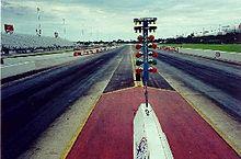 A dragstrip is a facility for conducting automobile and motorcycle acceleration events such as drag racing. Although a quarter mile (1320 feet, 402 m) is the best known measure for a drag track, many tracks are eighth mile (201 m) tracks, and the premiere classes will run 1,000 foot (304.8 m) races. The race is begun from a standing start which allows three factors to affect the outcome of the race: reaction time, torque, and traction.