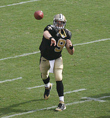 Drew Christopher Brees (/briːz/;[1] born January 15, 1979) is an American football quarterback for the New Orleans Saints of the National Football League (NFL). He had a successful college football career at Purdue University, becoming one of the most decorated players in Purdue and Big Ten Conference history. Brees set two NCAA records, 13 Big Ten Conference records, and 19 Purdue University records during his college career. He remains the Big Ten record-holder in several passing categories, including completions (1,026), attempts (1,678), and yards (11,792). Brees was chosen by the San Diego Chargers with the first pick in the second round of the 2001 NFL Draft. He earned the starting job with the Chargers in 2002 and made the Pro Bowl in 2004. Nine months after suffering a dislocation in his right shoulder joint and a tear of the labrum and rotator cuff, Brees signed with the Saints as a free agent in 2006, where he has played since. He experienced immediate success in New Orleans, leading the Saints to their first Super Bowl in Super Bowl XLIV and helping the team to a 31–17 victory over the Indianapolis Colts.