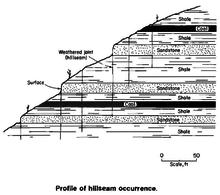 In 1989 the U.S. Bureau of Mines published a study of eastern Kentucky drift mines as part of an ongoing research program to characterize the outcrop barrier zone. "Hillseams" were identified as the dominant geologic cause of roof instability unique to the outcrop barrier zone, with many roof fall injuries and fatalities attributed to them. Hillseam is the eastern Kentucky miners term for weather-enlarged tension joints that occur in shallow mine overburden where surface slopes are steep. Hillseams are most conspicuous within 200 ft laterally of a coalbed outcrop and under 300 ft or less of overburden. Hillseams form by stress relief, and therefore tend to parallel topographic contours and ridges. They can intersect at various angles, especially under the nose of a ridge, and create massive blocks or wedges of roof prone to failure. Examples of hillseams are described in both outcrop and in coal mine roof to establish their geologic character and contribution to roof failure.[18]