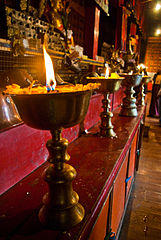There are many smaller buildings scattered around the ridge. They are accessed by steep steps, or by wooden ladders in a few cases.[4] There are several temples above the main chanting hall, which almost all contain a statue of Jigten Sumgön. A small building above the tsokchen (assembly hall) is dedicated to Achi, who protects the monastery, with depictions of her peaceful and wrathful manifestations. A pilgrimage trail runs around the monastery from below the chanting hall up to the crest of the ridge and the sky burial site at 14,975 feet (4,564 m), and then skirts various chörtens and shrines before descending to the starting point. The monastery has a guest house and a tea shop.[9]