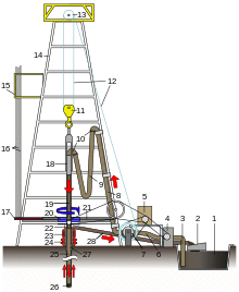- Drill bit: (#26) is a device attached to the end of the drill string that breaks apart the rock being drilled. It contains jets through which the drilling fluid exits.