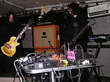 Typically, the electric guitar is performed with a large amount of reverb or audio feedback[2] while vocals, if present, are usually growled or screamed. Songs often lack beat or rhythm in the traditional sense and are typically very long. The experience of a drone metal performance has been compared by novelist John Wray in The New York Times to listening to an Indian raga in the middle of an earthquake.[2] Wray also states, "It's hard to imagine any music being heavier or, for that matter, very much slower."[2] A pioneer band of drone metal called Sunn O))) has indicated a kinship with sound sculpture.[2] Jan Tumlir indicates a "sustained infra-sound rumble of sub-bass—so-called brown noise".[3]
