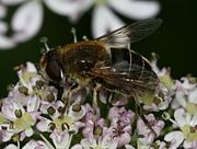 Eristalis is a large genus of hoverflies, family Syrphidae, in the order Diptera. Several species are known as drone flies (or droneflies) because they bear a resemblance to honeybee drones. Drone flies and their relatives are fairly common generalist pollinators,[2] the larvae of which are aquatic, and breathe through a long, snorkel-like appendage, hence the common name rat-tailed maggots.[1][3]