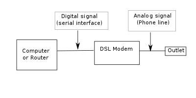 The customer end of the connection consists of a terminal adapter or "DSL modem". This converts data between the digital signals used by computers and the analog voltage signal of a suitable frequency range which is then applied to the phone line.