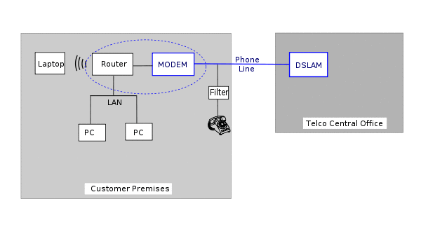 The accompanying figure is a schematic of a simple DSL connection (in blue). The right side shows a DSLAM residing in the telephone company's telephone exchange. The left side shows the customer premises equipment with an optional router. The router manages a local area network (LAN) which connects PCs and other local devices. With many service providers, the customer may opt for a modem which contains both a router and wireless access. This option (within the dashed bubble) often simplifies the connection.