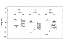 A singly ionized atom of dubnium (Db+) should lose a 6d electron compared to a neutral atom; the doubly (Db2+) or triply (Db3+) ionized atoms of dubnium should eliminate 7s electrons, unlike its lighter homologs. Despite the changes, dubnium is still expected to have five valence electrons; 7p energy levels have not been shown to influence dubnium and its properties. As the 6d orbitals of dubnium are more destabilized than the 5d ones of tantalum, and Db3+ is expected to have two 6d, rather than 7s, electrons remaining, the resulting +3 oxidation state is expected to be unstable and even rarer than that of tantalum. The ionization potential of dubnium in its maximum +5 oxidation state should be slightly lower than that of tantalum and the ionic radius of dubnium should increase compared to tantalum; this has a significant effect on dubnium's chemistry.[3]