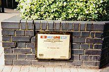 A picture of Dudley port station's lower level in 2001. The diagonal brick structure on the right is a former stairway. | |