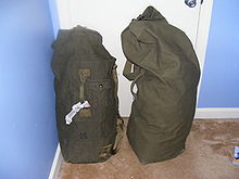 A duffel bag, duffle bag, or kit bag is a large bag made of natural or synthetic fabric (typically canvas), historically with a top closure using a drawstring.[1] Generally a duffel bag is used by non-commissioned personnel in the military, and for travel, sports and recreation by civilians.[2] When used by sailors or marines a duffel is known as a seabag. A duffel's open structure and lack of rigidity makes it adaptable to carrying sports gear and similar bulky objects.