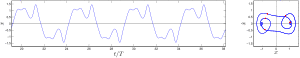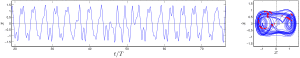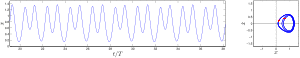 Some typical examples of the time series and phase portraits of the Duffing equation, showing the appearance of subharmonics through period-doubling bifurcation – as well chaotic behavior – are shown in the figures below. The forcing amplitude increases from to The other parameters have the values: and The initial conditions are and The red dots in the phase portraits are at times which are an integer multiple of the period [10]