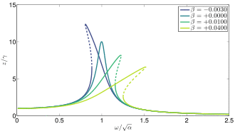 For the parameters of the Duffing equation, the above algebraic equation gives the steady state oscillation amplitude at a given excitation frequency.