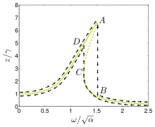 - when the angular frequency is slowly increased (with other parameters fixed), the response amplitude drops at A suddenly to B,