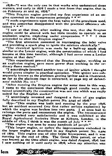 Dugald Clerk was the author of 3 comprehensive books covering the development of the oil and gas engine from its early inception, and including details of his own work in this area. The first edition was produced in 1886, and the notes here are taken from the 7th edition,[7] revised and updated up to 1896. In "Gas and Oil Engines",[7] Clerk refers to the significant earlier gas engine patents of Barnett in 1838 and Wright in 1833.