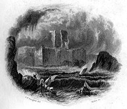 The castle towers had communication with the sea, and dip low in many places. North-east from the front of the castle is a large natural cavern, chiefly of black stone, which looks like the mouth of the Acheron – a place that leads to melancholy streams. This spot is supposed to have formed part of the dungeon where prisoners were confined, such as Gavin Douglas, Bishop of Dunkeld, who was a prisoner here in 1515. There is, however, also a dark postern which gives access to a rocky inlet from the sea, and it seems probable that it was through this that Sir Alexander Ramsay and his followers entered with a supply of provisions to the besieged in 1338.[2]