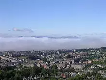 The climate, like the rest of lowland Scotland, is Oceanic (Köppen-Geiger classification Cfb).[82] Mean temperature and rainfall are typical for the east coast of Scotland, and with the city's sheltered estuarine position, mean daily maxima are slightly higher than coastal areas to the North, particularly in spring and summer.[83] The summers are still chilly when compared with similar latitudes in continental Europe, something compensated for by the mild winters, similar to the rest of the British Isles. The nearest official Met Office weather station is Mylnefield, Invergowrie which is about 4 miles (6.4 km) west of the City Centre.