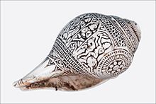 A Shankha is a conch shell of ritual and religious importance in Hinduism. It is the shell of a large predatory sea snail, Turbinella pyrum, found in the Indian Ocean..