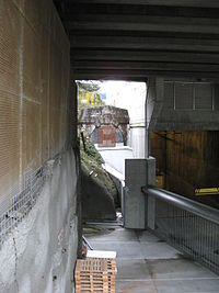 The tunnel was originally built by the Northern Construction Company in 1932 connecting the Canadian Pacific Railway railyards on Burrard Inlet and False Creek at a cost of $1.6 million. The tunnel's original east portal was located further south than the current portal, easing trains into the False Creek yards on a gentle southward curve. It was clearly visible until about 2005, where it was almost completely hidden next to an outdoor storage area behind the Costco. The original portal was destroyed in 2011 to make way for a new development, but there remains an abandoned section of tunnel, unused by SkyTrain.[1][2][3]