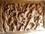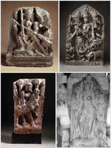 Archeological discoveries suggest that these iconographic features of Durga became common throughout India by about the 4th century CE, states David Kinsley – a professor of religious studies specialising on Hindu goddesses.[63] Durga iconography in some temples appears as part of Mahavidyas or Saptamatrkas (seven mothers considered forms of Durga). Her icons in major Hindu temples such as in Varanasi include relief artworks that show scenes from the Devi Mahatmya.[64]