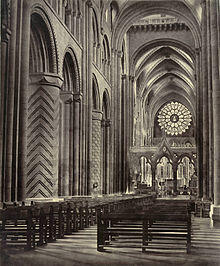 In 1794 the architect James Wyatt drew up extensive plans which would have drastically transformed the building, including the demolition of the Galilee Chapel, but the Chapter changed its mind just in time to prevent this happening. Wyatt renewed the 15th-century tracery of the Rose Window, inserting plain glass to replace what had been blown out in a storm.[25]