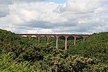 This new coastal line had to cross the denes at Hawthorn, Castle Eden and Crimdon, each requiring a substantial viaduct; one of the most imposing of these, Denemouth Viaduct (spanning Castle Eden Dene), is 141 feet (43 m) from ground to rail level, and consists of 10 arches, each with a span of 60 feet (18 m).[17] The construction of these viaducts required the opening of a special brickfield and, in the case of Denemouth Viaduct, the creation of a temporary 800 feet (240 m) cableway spanning valley.[17]