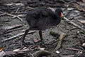 The dusky moorhen feeds both on land and in water. It diet consists of seeds, the tips of shrubs and grasses, algae, fruits, molluscs, and other invertebrates. It will also consume carrion, bread, and droppings from birds including gulls and ducks.[6][7][8] The chicks are fed mostly on annelid worms and molluscs, with plant matter gradually being given in increasing proportions by the parents as the young mature.[8][9]
