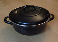 A Dutch oven (not to be confused with masonry oven) is a thick-walled cooking pot with a tight-fitting lid. Dutch ovens are usually made of seasoned cast iron; however, some Dutch ovens are instead made of cast aluminium, or ceramic. Some metal varieties are enameled rather than being seasoned, and these are sometimes called French ovens. Dutch ovens have been used as cooking vessels for hundreds of years. They are called casserole dishes in English-speaking countries other than the United States (casserole means "pan" in French), and cocottes in French. They are similar to both the Japanese tetsunabe and the sač, a traditional Balkan cast-iron oven, and are related to the South African potjiekos, the Australian Bedourie oven and Spanish cazuela.