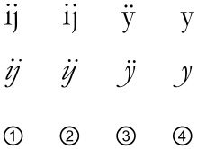 - ^ The digraph IJ behaves like a separate letter for capitalisation. In alphabetical order, IJ may not be distinguished from with Y (usual for telephone directories), or it may come between ii and ik (which is common in dictionaries). In Dutch primary education the (more common) digraph IJ often replaces the (less common) Y as the 25th letter of the alphabet.