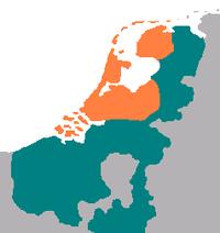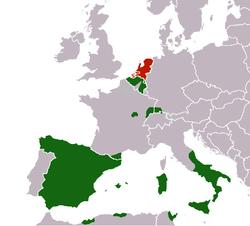 In a series of marriages and conquests, a succession of dukes of Burgundy expanded their original territory by adding to it a series of fiefdoms, including the Seventeen Provinces.[4] Although the Duchy of Burgundy itself had been lost to France in 1477, the Burgundian Netherlands were still intact when Charles of Habsburg, heir to the Netherlands via his grandmother Mary, was born in Ghent in 1500. Charles was raised in the Netherlands and spoke fluent Dutch, French, and Spanish, along with some German.[5] In 1506, he became lord of the Netherlands. In 1516, he inherited the kingdoms of Spain, which had become a worldwide empire with the Spanish colonization of the Americas, and in 1519, he inherited the Archduchy of Austria. Finally, he was elected Holy Roman Emperor in 1530.[6] Although Friesland and Guelders offered prolonged resistance under Grutte Pier and Charles of Egmond respectively, virtually all of the Netherlands had been incorporated into the Habsburg domains by the early 1540s.