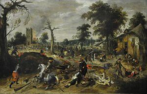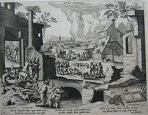 The atmosphere in the Netherlands was tense due to the rebellion, preaching of Calvinist leaders, hunger after the bad harvest of 1565, and economic difficulties due to the Northern Seven Years' War. In early August 1566, a monastery church at Steenvoorde in Flanders (now in Northern France) was sacked by a mob led by the preacher Sebastian Matte.[19] This incident was followed by similar riots elsewhere in Flanders, and before long the Netherlands had become the scene of the Beeldenstorm, a riotous iconoclastic movement by Calvinists, who stormed churches and other religious buildings to desecrate and destroy church art and all kinds of decorative fittings over most of the country. The number of actual image-breakers appears to have been relatively small,[20] and the exact backgrounds of the movement are debated,[21] but in general local authorities did not rein in the vandalism. The actions of the iconoclasts drove the nobility into two camps, with Orange and other grandees opposing the movement and others, notably Henry of Brederode, supporting it. Even before he answered the petition by the nobles, Philip had lost control in the troublesome Netherlands. He saw no other option than to send an army to suppress the rebellion. On 22 August 1567, Fernando Álvarez de Toledo, 3rd Duke of Alba, marched into Brussels at the head of 10,000 troops.[22]