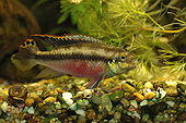 Dwarf cichlid is a term used by fishkeeping hobbyists to describe an arbitrary assemblage of small-sized fish from the family Cichlidae. Although the grouping is widely used in the aquarium industry and hobby, the grouping has no taxonomic or ecological basis and is poorly defined.[1] Though dwarf cichlids are by definition small-sized cichlids, there is no accepted maximum length of a dwarf-sized cichlid. Some authors suggest a maximum of 10 centimetres (3.9 in.), while other suggest a maximum length of 12 centimetres (4.7 in.).[1][2] The term is most frequently used to describe small South American or West African species which are suitable for soft, acidic (pH 4 to 7) densely planted aquariums,[1] however, some aquarists and authors include within this "dwarf cichlid group" a variety of small-sized cichlids from the alkaline African rift lakes.[2][3]