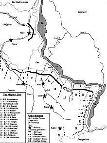 - ^ The main fortifications were single- and double-casemates, dug into hills from 0.25–1.25 mi (0.40–2.01 km) apart, with firing chambers containing machine-guns and anti-tank guns to enfilade the anti-tank and anti-infantry obstacles further forward. An upper floor was roofed by 5–12 ft (1.5–3.7 m) of concrete and living quarters for 25–35 men were built below with walls 2–5 ft (0.61–1.52 m) thick behind an earth overing; a trench 10 ft (3.0 m) deep surrounded by barbed wire and grenade-throwers protected the work. Power came from diesel engines and the largest forts (ouvrages) had 1,000–1,200 infantry, gunners and engineers.[10]
